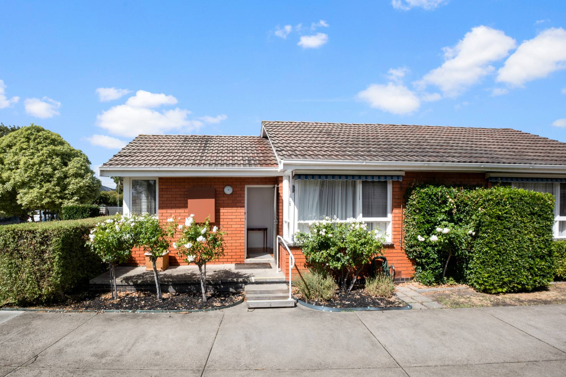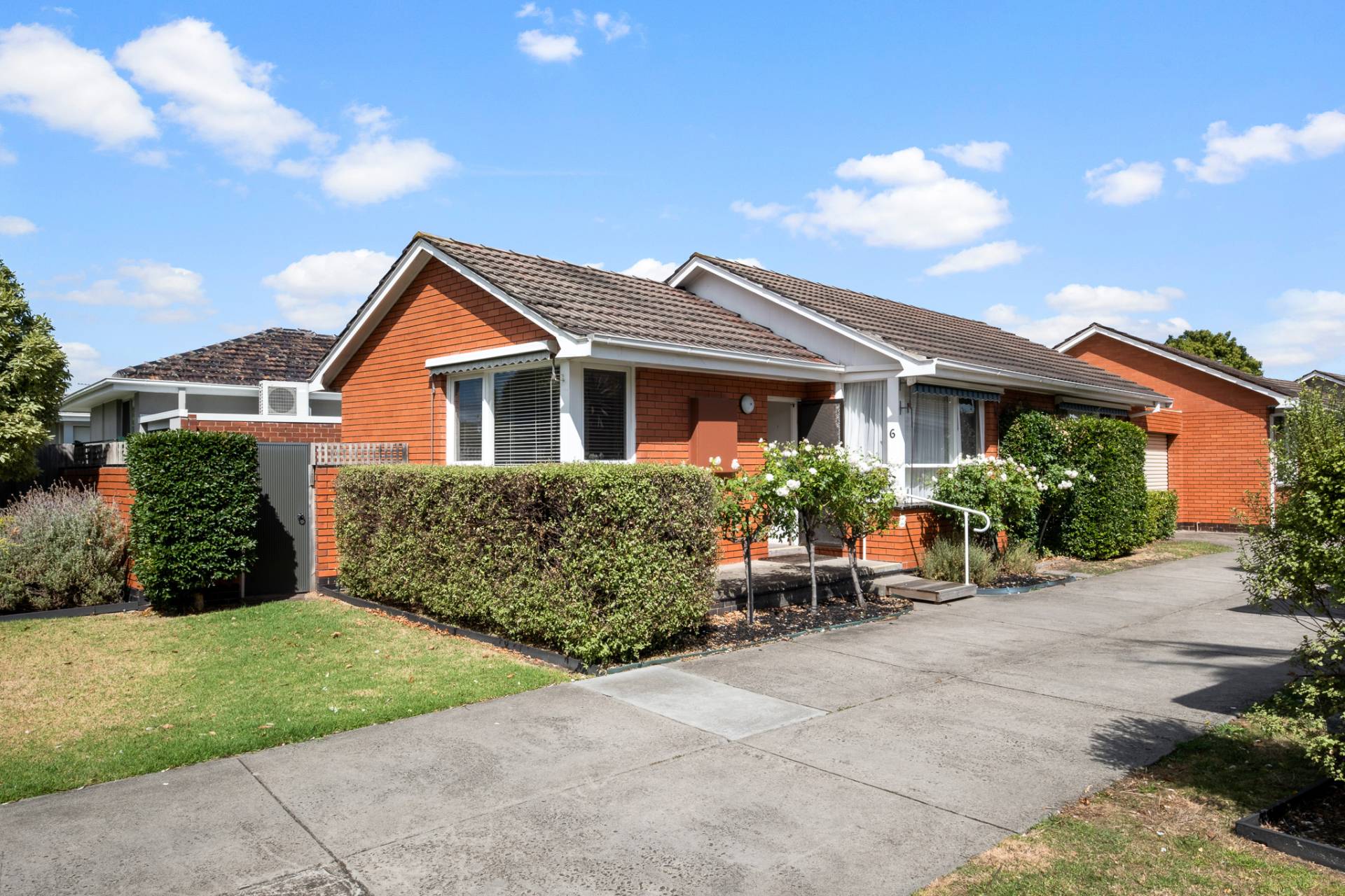 This single-level north-facing villa, one of just six, combines easy modern living with attractive mid-century details.  Set in the sought-after Bayside suburb of Mentone with easy walking distance to the beach, shops and excellent nearby schools, this two-bedroom home is ready for move in. In a prime position set back from the road by a small communal garden, the entrance area framed by established white standard roses is instantly inviting.