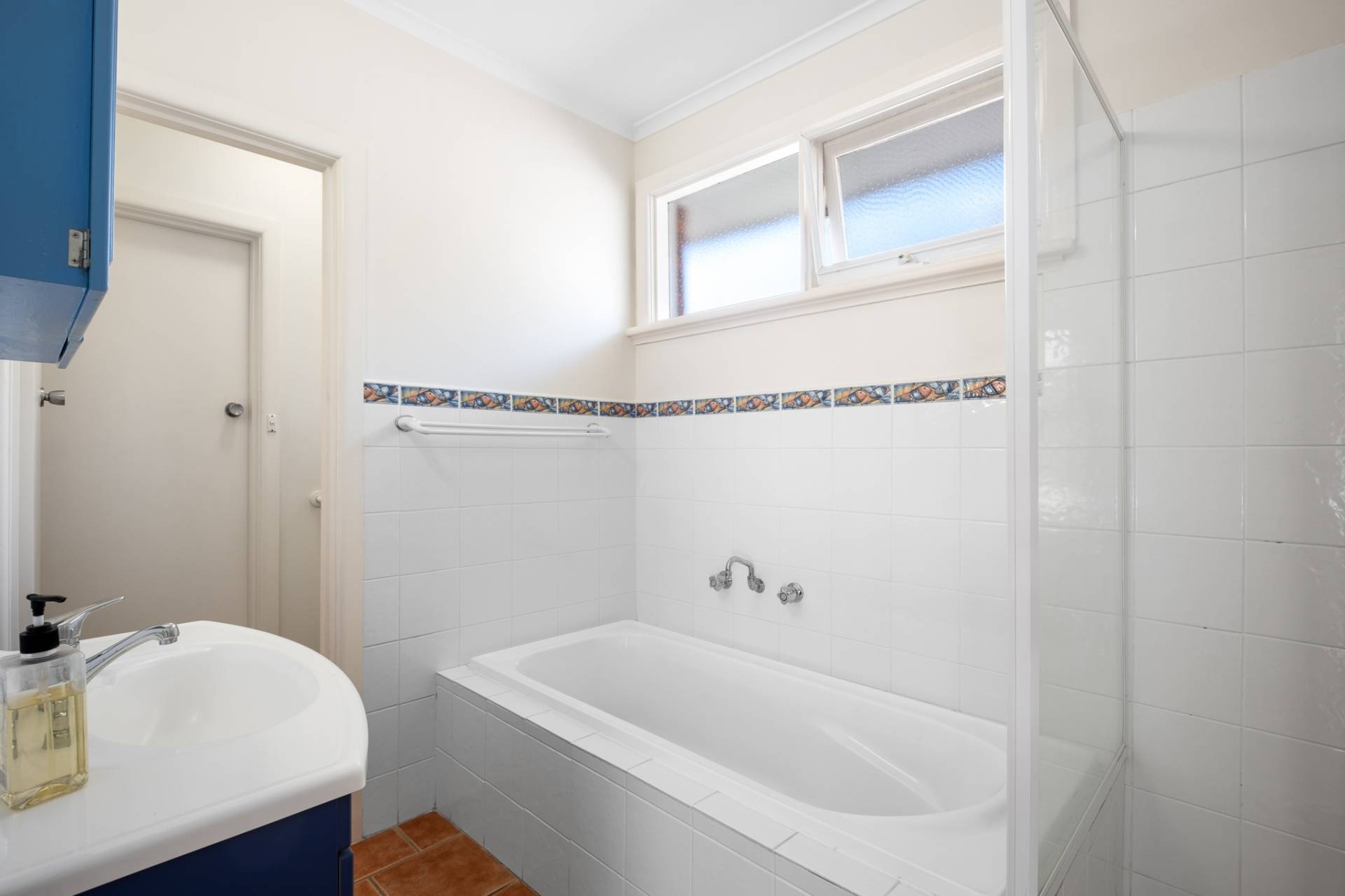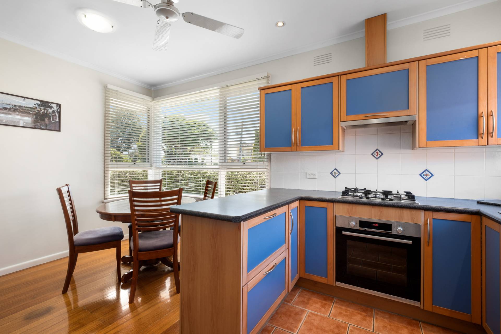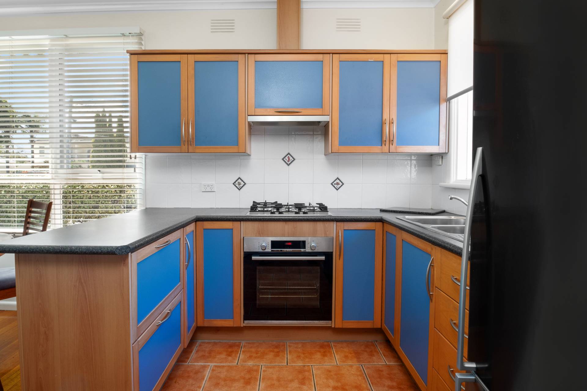 The U-shaped kitchen boasts up-to-date stainless-steel Bosch appliances with plenty of bench and storage space in warm natural materials. Terracotta-coloured tiled floors in the kitchen lead through the adjoining laundry, separate toilet and bathroom with bath, separate shower and fresh white tiles with stylish accent dado tiles.