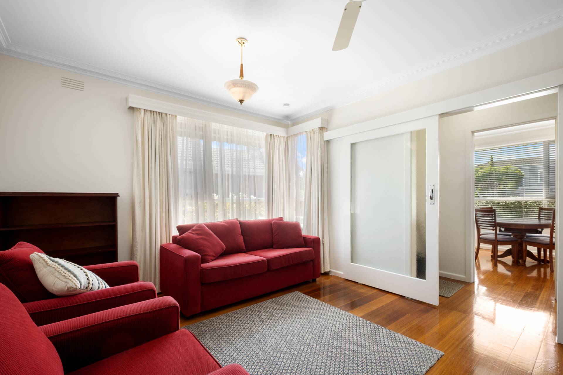 Off the entrance hall, an open-plan kitchen/dining area with corner views of the front garden to the left, and to the right, a spacious lounge screened by a sliding textured glass door – a nod to its mid-century origins - providing privacy and soft, natural light.  Warm polished floorboards are beautifully highlighted throughout by freshly painted white walls.