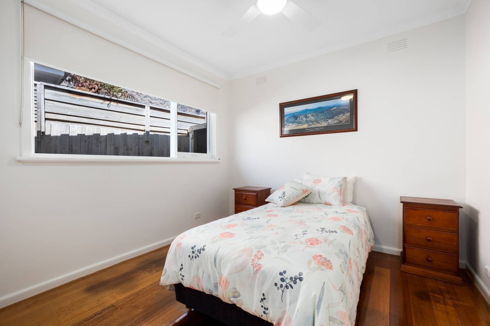 Adjacent to the lounge is a spacious master bedroom with generous built-in robes. A second bedroom, also with large built-in robes, links conveniently through to the bathroom. Ceiling fans and split-system air conditioning units provide heating and cooling to the living areas.
